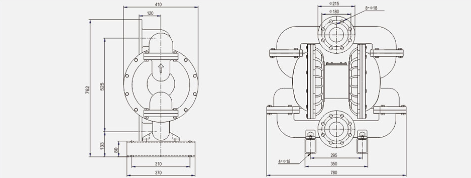 4.安装时,进、出料口管路管径不要小于泵进、出料口口径,如输送高粘度流体时,管路管径最好大于泵口径,以利于流通。(进料口管路管径变小会导致负压损坏膜片,出料口管路管径变小会降低流量。)